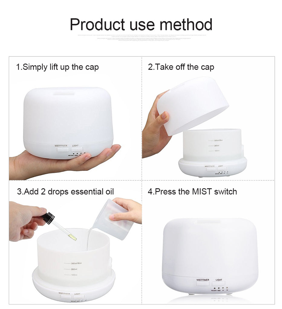 - Essential oil diffuser holds up to 300ml of water, enough for large space use. You can switch between high and low mist with the button to extend the duration of misting. Diffuser automatically powers off when water level is too low for safe use.